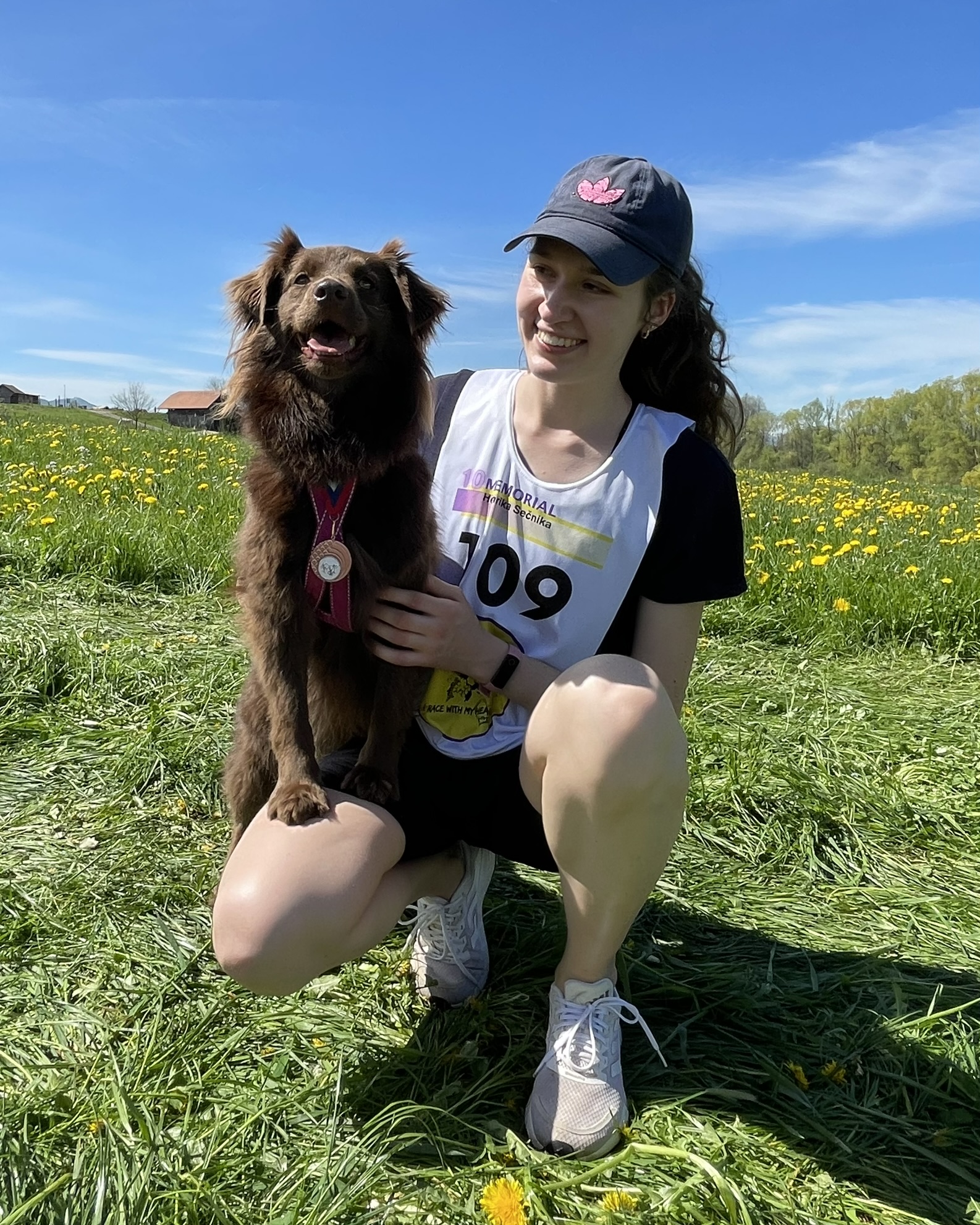 Leto prej, spomladi 2022, pa je mi je življenje na glavo obrnila navihana rešenka Bruna. Splet okoliščin in naključij je pripeljal do tega, da je pri njenih približno 8 mesecih našla svoj stalen dom pri meni. Kaj hitro sem ugotovila, da je to zelo drugačen pes od Thora. Bruna me je »prisilila«, da se poglobim v pasjo psihologijo, govorico in dejavnike genetike, ki je pri njej en velik vprašaj, saj je bila zapuščena kot edini mladiček. Njena vzgoja in šolanje je zahtevalo veliko mero potrpežljivosti in vztrajnosti, hkrati pa se še zdaj pojavljajo novi izzivi, s katerimi se skupaj spopadava. Tako sva spomladi 2023 najprej uspešno opravili Bbh izpit, nato pa jeseni postali samostojni terapevtski par. Vmes pa sva se navdušili nad pasjimi športi – canicrossom in agilityjem.